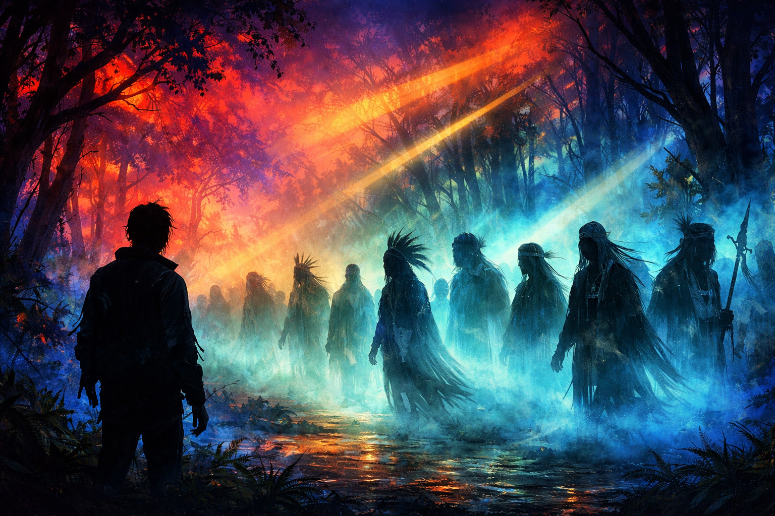 They were ghosts — unmistakably ghosts — the spirits of Native American people, sliding out from the deep woods and rising up from the ground itself. Semi-transparent, otherworldly, they moved in long, silent lines, hundreds of them drifting past… some straight through me…
